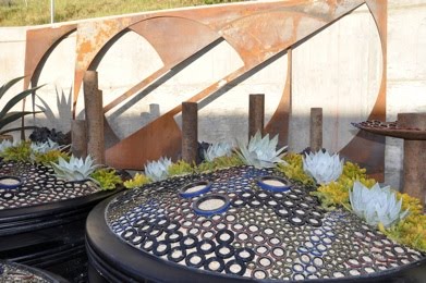 un article sur une de ses piscines. Pour ma part, j'aime bien cette composition de rondelles, d'agaves et de succulentes trouvée sur le
