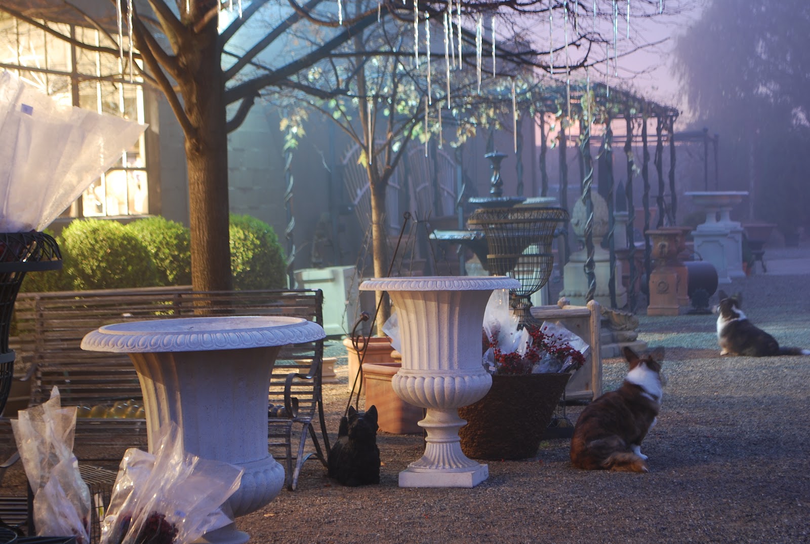 Foggy atmosphere, dog's shadows, mistery, sunset pink lights ...